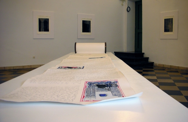 Een tentoonstelling (2004) waarbij poëziefragmenten gezeefdrukt op cursuspapier de kunstwerken aan de muur waren.
