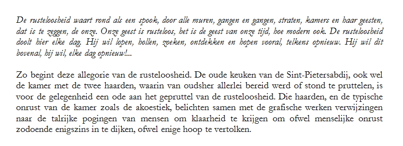 Een tentoonstelling (2007) onder die titel in de Kunsthal Sint-Pietersabdij te Gent. Het centrale werk is een op de locatie geïnspireerde boekrol (4 meter) die een allegorie op de rusteloosheid bevat, verlucht met etsen. De boekrol werd geflankeerd door vijf andere etsen.