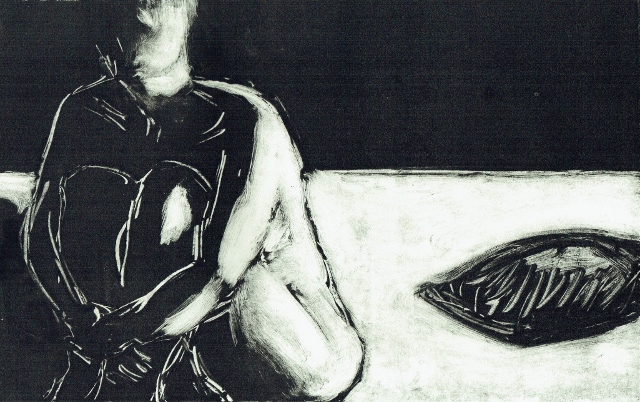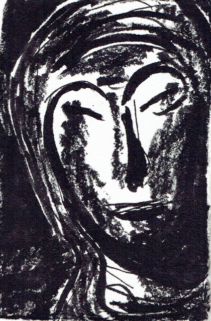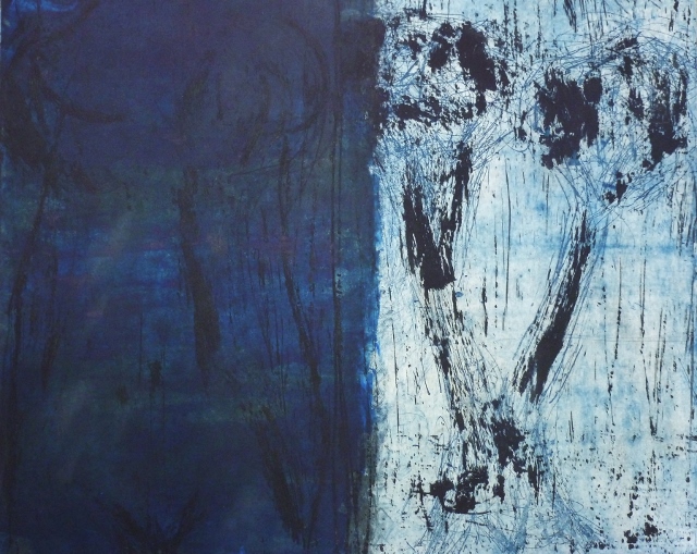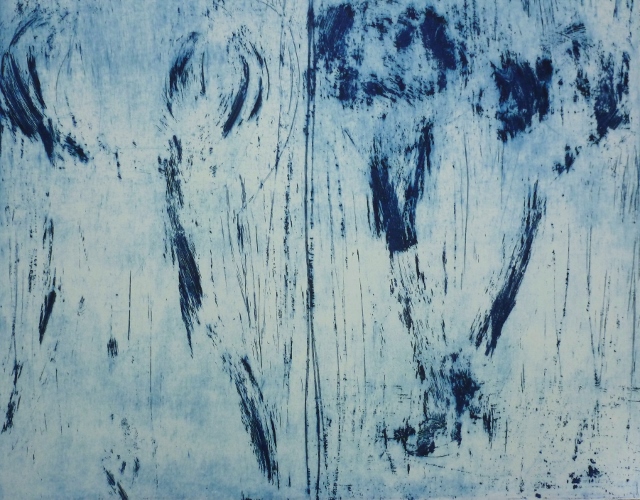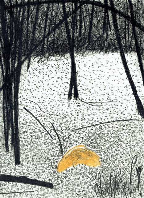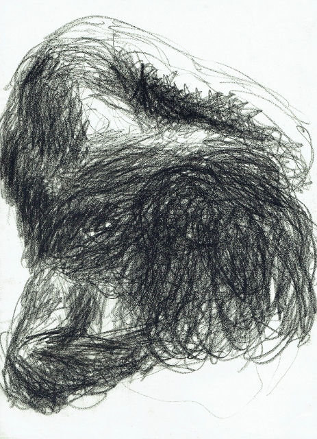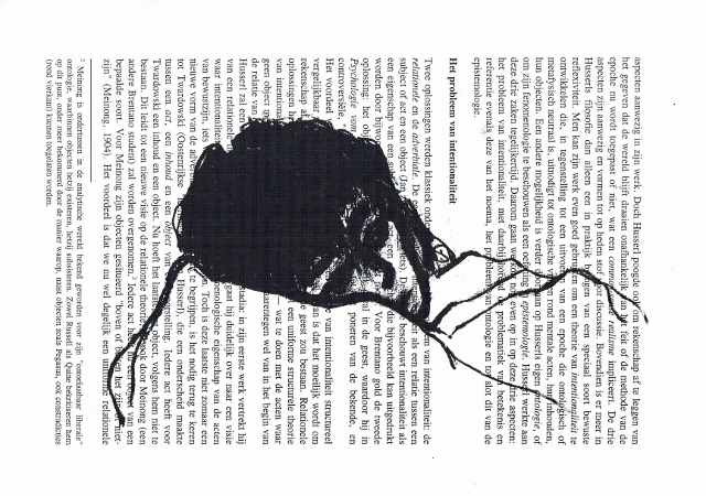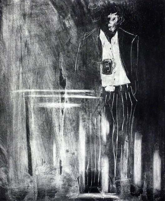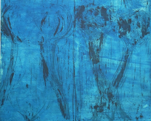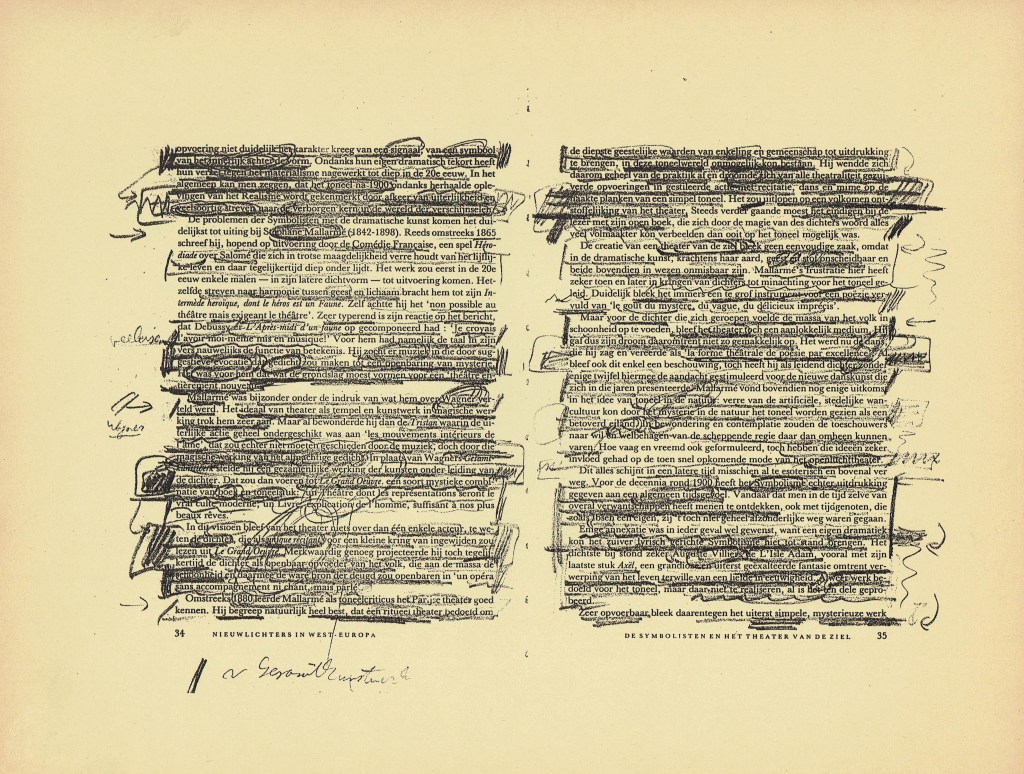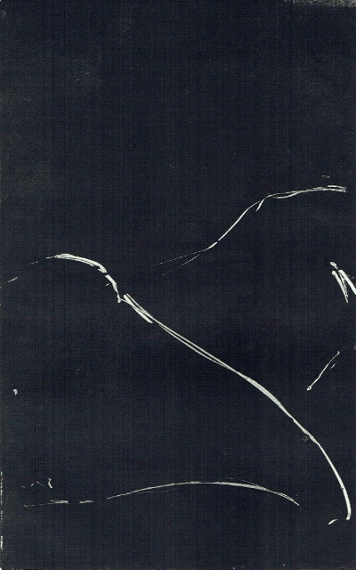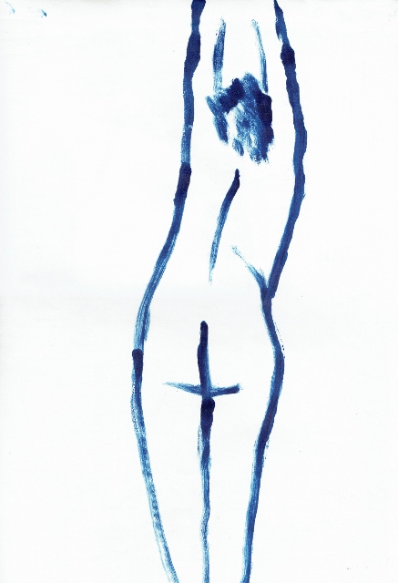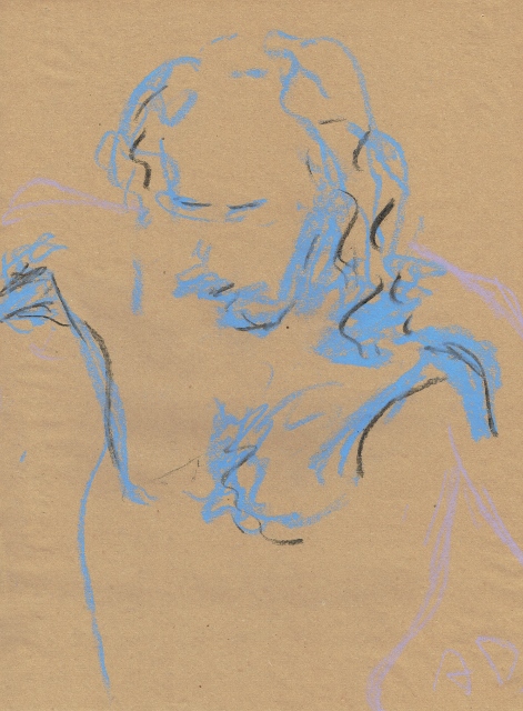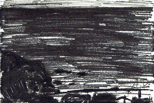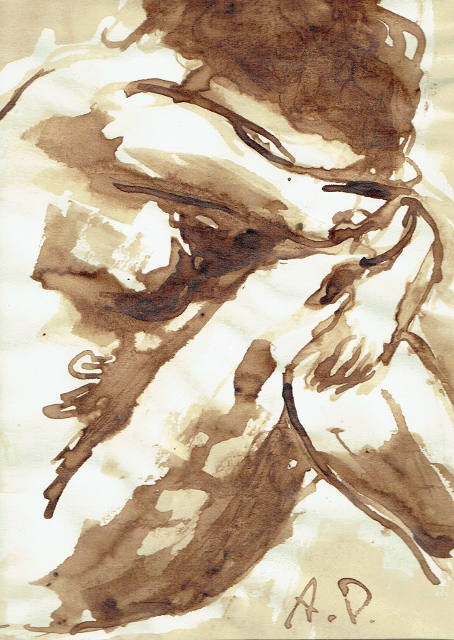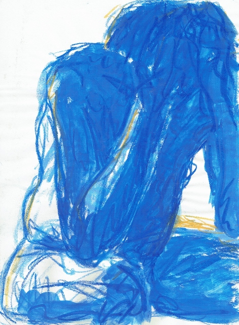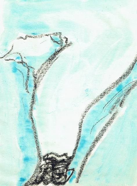 De tekeningen zijn van vetkrijt en flauwe en sterkere koffie (‘uiteraard’, zegt hij dan). Datzelfde thema leidde ook tot zijn bundel aquamarijn, waarvan tien exemplaren uitgebracht werden in een luxedoos met één originele tekening. De tien tekeningen zijn buiten deze reeks om op A5 uitgevoerd, in aquamarijnblauw.