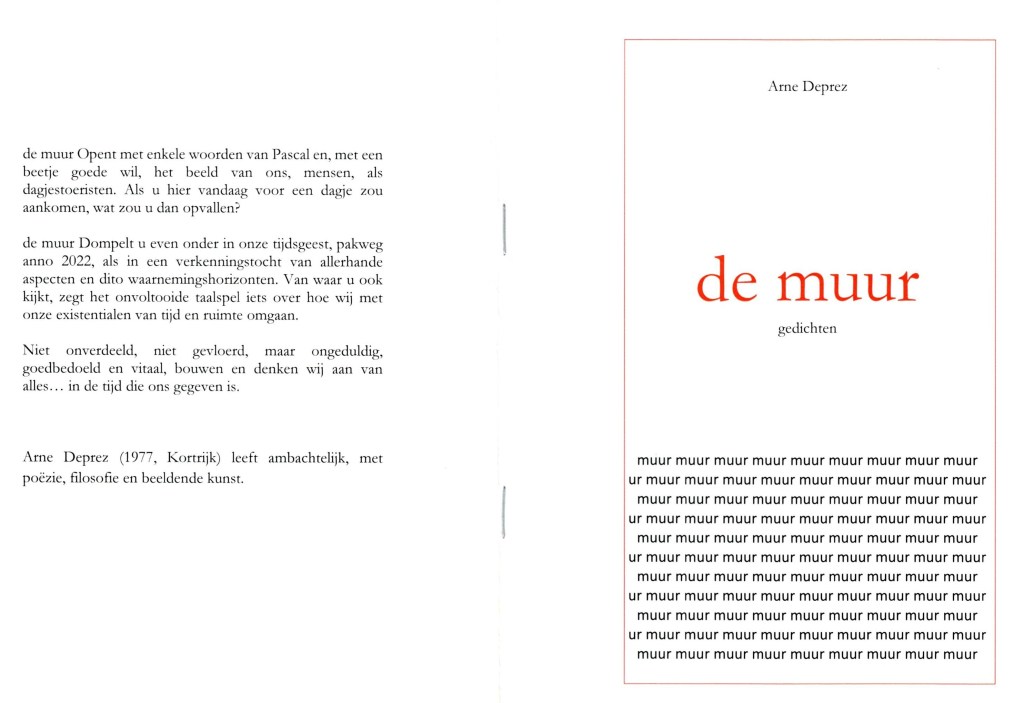 de muur dompelt u onder in onze tijdsgeest, pakweg anno 2022. als in een verkenningstocht van allerhande aspecten en dito waarnemingshorizonten. Van waar u ook kijkt, zegt het onvoltooide taalspel iets over hoe wij met onze existentialen van tijd en ruimte omgaan.
