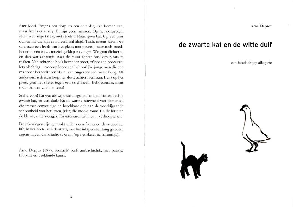 de zwarte kat en de witte duif tenslotte, is een fabelachtige allegorie die contempleert wat het in dit leven kan betekenen dat de Dood ons vooruit loopt, of wij achter Hem…